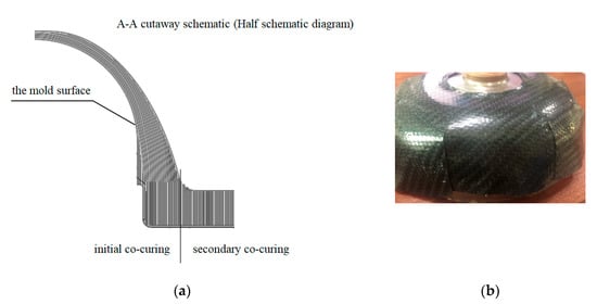Considering the operability of the actual production process, the final optimized lay-up is illustrated in Figure 3a. The optimized lamination of the composite was cured by a secondary co-curing process. The lamination was laid on the core die, and the lower half of the connector was cured by a molding process after lamination was completed. The secondary co-curing treatment was conducted when the top end face of the connector was laid up again. After curing, the connector was machined to the theoretical shape. Finally, the intermediate insert was embedded into the composite connector body using an adhesive.