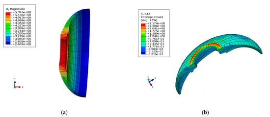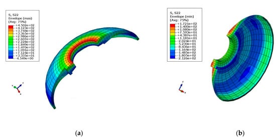 Maximal tensile and compression stress diagram in the Y-direction: (a) Tensile stress (σy = 4.502 × 102 MPa); (b) Compression stress (σy = −2.126 × 102 MPa).