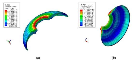Maximal tensile and compressive stress diagrams in the X-direction: (a) Tensile stress (σx = 4.92 × 102 MPa); (b) Compressive stress (σx = −1.589 × 102 MPa).