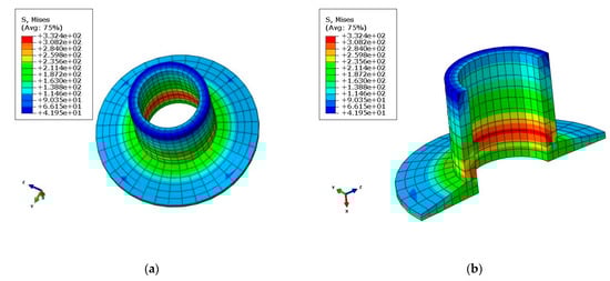 Von Mises stress of AL inserts (σy = 332.4 MPa): (a) Von Mises stress (overall view); (b) Von Mises stress (partial view).