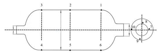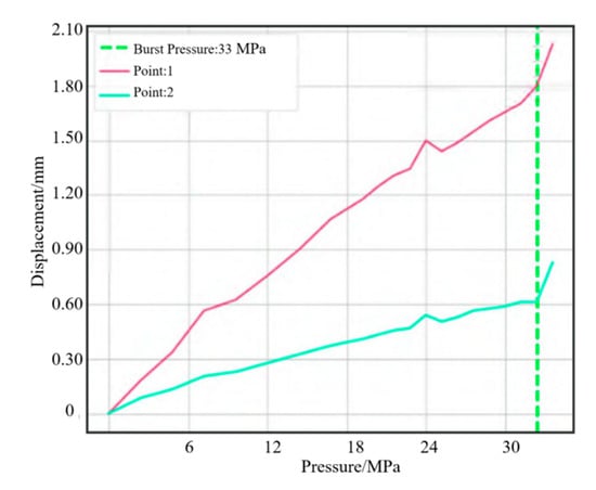 A water pressure blasting experiment is designed for the shell to monitor the strain displacement change of the shell during blasting. Strain monitoring points were uniformly set on the shell and front connector, as shown in Figure 9. Deformation was relatively larger in the process of the booster, with resin shell cracking. Due to some damage of the strain gauge, the strain value could not be displayed. The complete results of the test points were generated, with each strain measuring point monitoring strain changes in both directions. The strain of point 8 at the small polar hole generated a sudden change. Two points were set for displacement change monitoring, which coincided with strain monitoring points 2 and 5. The results of extracting the two point shifts are shown in Figure 10. When the pressure reached 33 MPa, displacement occurred at both points. Combined with the strain displacement test results in the experiment, it can be seen that the actual burst pressure was 33 MPa. The hydrostatic test showed that the cylinder could meet the internal pressure of 15 MPa in working conditions and 33 MPa in blasting conditions.