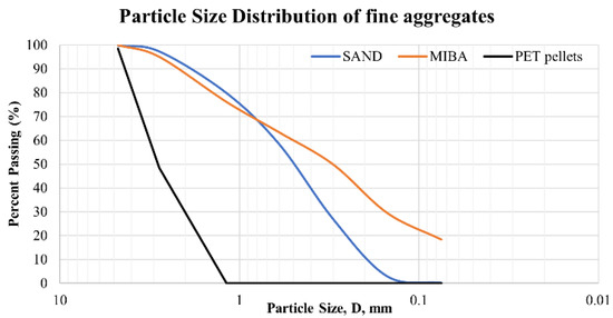 Sand, MIBA, and PET pellets (PET) were analyzed to investigate the particle size distribution, shape, surface texture, fineness modulus, water absorption, and specific gravity.