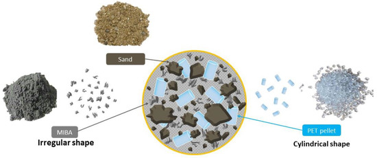 The PET bottle waste used in this study was in the form of PET pellets made from recycled PET bottle waste. The PET pellets were obtained from Grand Siam Polymer Co., Ltd. The bottom ash used in this study was mixed ash consisting of fly ash and bottom ash and was obtained from an incinerator in the Si Chang municipality. Sand, MIBA, and PET pellets were sieved prior to use, and the particle size (less than 4.75 mm) was passed through a No. 4 sieve.