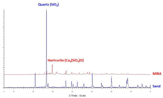 The X-ray diffraction pattern of raw materials is shown in Figure 3. The major crystalline phases of sand are quartz (SiO2) and orthoclase (KSi3AlO8). The major crystalline phases of MIBA are synthetic hartrurite (Ca3SiO5) and wollastonite (CaSiO3), whereas the minor mineral phases are marcasite (FeS2) and pyrrhotite (FeS).