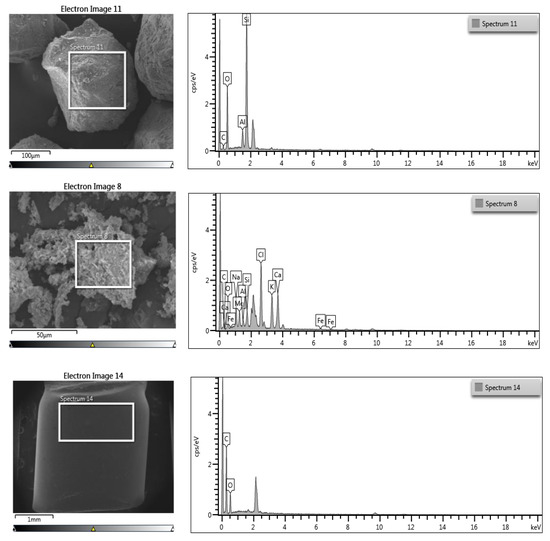 The microstructure and elemental composition of raw materials are shown in Figure 4. The particle morphologies were observed at 50× resolution for sand and MIBA and 30× resolution for PET pellets. The results showed that sand had a rough and angular surface, while MIBA was noticeably smaller and more porous than sand, which was confirmed at the same magnification. However, the PET pellets were much larger than sand and MIBA and had a smooth non-angular surface, and were nonporous. In addition, these products have different elemental components. For example, Si and C are the major elements of PET and sand, respectively. On the other hand, MIBA has a relatively diverse composition consisting of several elements, with CaO being the most prominent.