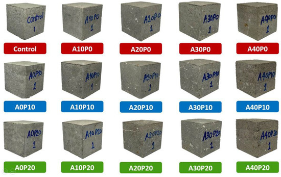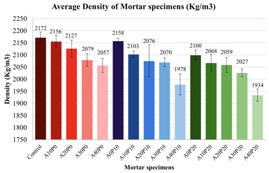 Figure 10 shows the density of mortar specimens. The tendency of density is similar to that of compressive strength, indicating that these two parameters are correlated. The control has the highest density (2172 kg/m3), followed by A0P10 (2158 kg/m3) and A10P0 (2156 kg/m3). On the other hand, A40P20 presented the lowest density (1979 kg/m3).