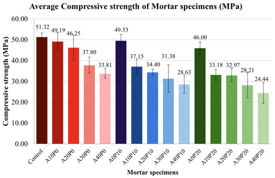 Figure 6 shows the compressive strengths of mortar specimens after 56 days. The results show that the compressive strength of each group decreased as the amount of MIBA used to replace sand increased. Four mortar specimens have compressive strengths greater than 40 MPa, but less than the control (51.32 MPa), as follows: A10P0 (49.19 MPa), A20P0 (46.25 MPa), A0P10 (49.53 MPa), and A0P20 (46 MPa).