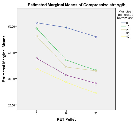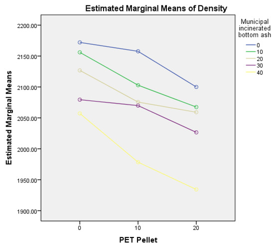 The density analysis results (Table 6) revealed that the amount of PET pellets and MIBA significantly affected the specimen’s density. It can be observed that there is no interaction effect when using PET pellets with MIBA, F(8, 60) = 1.44, p = 0.2. The plots of the estimated marginal mean for different replacement levels of PET and MIBA (Figure 11) show a similar trend to the compressive strength plot.