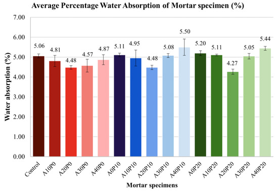 Figure 8 shows the water absorption of mortar specimens. The results indicate that the highest water absorption rate was A40P10 (5.5%), followed by A40P20 (5.44%), whereas the lowest was A20P20 (4.27%). This experiment shows that using 20% MIBA caused the lowest water absorption for each group. In addition, among all ratios, 20% MIBA and 20% PET pellets have the lowest water absorption. It can be concluded that replacing sand with 20% PET pellets and 20% MIBA resulted in the best aggregate arrangement with the least porous matrix and less water absorption.