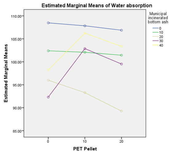 The data analysis of water absorption (Table 5) revealed an interaction effect between PET pellets and MIBA, F (8, 60) = 2.22, p = 0.004. This demonstrates that combining different levels of PET pellets and MIBA significantly impacts the specimen’s water absorption. Furthermore, the plot of estimated marginal means for different replacement levels of PET pellets and MIBA (Figure 9) shows that the use of 30% and 40% MIBA tends to differ from other scenarios.