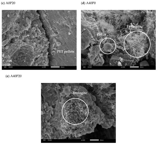 The microstructure of mortar specimens was identified using a scanning electron microscope (IT300) at 1500× magnification. Only mortar specimens selected from the control (no waste), A0P10 (best performance), A0P20 (highest PET pellet replacement), A40P0 (highest MIBA replacement), and A40P20 (worst performance, most uses of both wastes) were analyzed. The results revealed calcium silicate hydrate (CSH) and ettringite on the surface of mortar specimens (Figure 12). Ettringite shows needle-like crystals resulting from the hydration reaction of tricalcium aluminate (C3A) as sulfate ions of gypsum reacted with water. On the other hand, CSH is formed by the hydration reaction of calcium silicates (C3S and C2S) with water. Therefore, CSH is like a gel and serves as a binder that connects the aggregates and provides strength to the specimens [27].