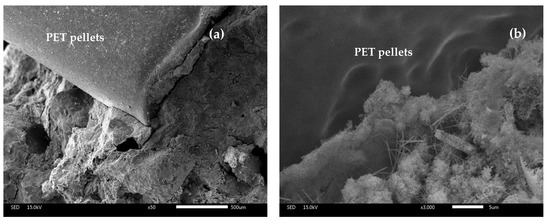 The microstructures of mortar specimens with PET pellets are shown in Figure 13a,b at 50× and 3000× magnifications, respectively. The smooth surface of PET pellets was found to be poorly connected with the mixture, resulting in more free space and voids.