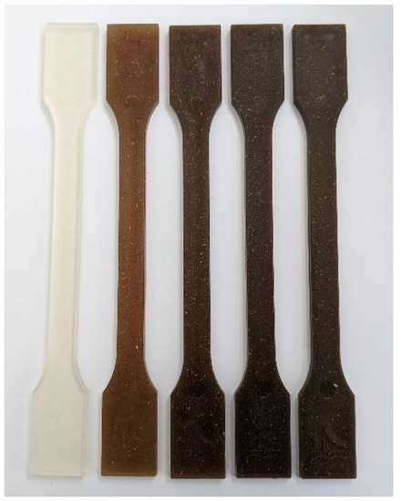Poly(lactic acid) (PLA) was supplied by Nature Works, USA (Ingeo 2003D grade) in a pellet form. The density and melting temperature of this PLA grade were 1.24 g/cm3 and 170 °C, respectively. Wood flour waste and rice husk were obtained from the Krishna Timber Store and a local farmer, Himachal Pradesh (India), respectively. The obtained fillers were sieved to achieve a particle size of 60 mesh. Thereafter, the fillers’ surface was modified using alkali treatment (2 wt.% sodium hydroxide solution) at room temperature for 12 hours. After washing them with distilled water four times, the treated fillers were oven dried for 4 hours at 80 °C. The PLA granules, wood waste and rice husk were dried in a DEGA-2500 (DE.GA S.p.A., Corte Franca, Italy) type dryer at 80 °C for 6 hours prior to melt processing in order to remove their inherent moisture content and thereby to prevent the hydrothermal degradation of the polymer during the melt processing. The PLA biocomposites were fabricated by melt compounding and injection molding using the compositional variations presented in Table 1. Melt mixing was performed using a co-rotating twin-screw extruder (Labtech LTE 20-44 type, Samut Prakarn, Thailand) with a rotational speed of 30 rev/min. The screw diameter and L/D ratio were 20 mm and 44, respectively. From the feeder to the die, the extruder barrel temperature was varied from 155 °C to 185 °C. Before further processing, the extruded materials were pelletized and dried at 80 °C for 6 hours. Subsequently, the test samples (Figure 1) were molded into dogbone-shaped specimens (EN ISO 527-2 type A), using an Arburg Allrounder Advance injection molding machine (420C Golden Edition; Arburg, Germany) with a screw of 35 mm diameter. The nozzle temperature of the injection unit was 195 °C, while the injection rate was 40 cm3/s. The holding pressure profile was set to 750-650-250 bar (for a total of 15 s). The mold temperature was set to 35 °C, with a residual cooling time of 30 s.