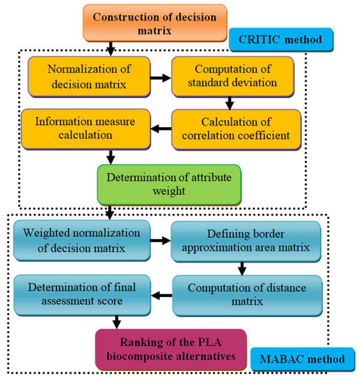 In general, many properties of PLA biocomposites increase with the inclusion of waste reinforcement. However, this enhancement in properties is affected by the type and amount of the incorporated fibers/particles. Moreover, the fabricated composite has its own performance for each individual characteristic; thus, a decision on the optimal composition with the highest degree of fulfillment for all material characteristics is essential. This can be accomplished using the multi-attribute decision-making (MADM) analysis [33,34]. MADM approaches are the systematic ways for determining the importance of attributes (material properties) by examining a specific application and selecting the best candidate material, while eliminating the inappropriate alternatives [35,36]. Various MADM approaches, such as AHP, GRA, CRITIC, TOPSIS, VIKOR, SAW, MEW, COPRAS, PSI and ELECTRE, etc., have been created to assist in rating material alternatives and picking the best one [37,38,39,40,41,42,43,44]. Among them, MABAC and CRITIC are two popular ones. The MABAC method is an outranking technique based on the distance of alternatives from a border approximate area matrix. Meanwhile, the MABAC technique is a very efficient ranking method due to its basic mathematical computations and ease of usage compared to other MADM techniques [42]. Unlike MABAC, CRITIC addresses how to determine the relative importance of a set of attributes in any MADM technique by applying the inter-criteria correlation [43]. Either of the two approaches is suitable for particular MADM problems and has successfully been applied in various engineering and management domains [41,42,43,44].