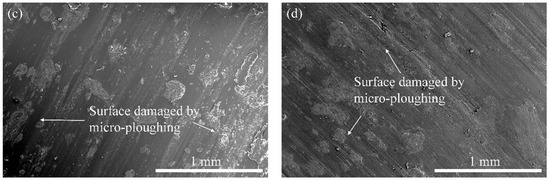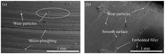 The observed trends in wear were evident by studying the worn surfaces of the composites, as presented in Figure 3. The wear of the unfilled PLA was mainly caused by extensive micro-ploughing due to the softening process of the matrix during sliding. The inclusion of the lower rice husk and/or wood waste (≥5 wt.%) particles helps the PLA matrix withstand the heat generated during sliding, and it keeps the matrix from being removed. The worn composite surface appeared smoother with fewer signs of micro-ploughing, suggesting a reduced wear of the composites. For composites with high filler loading (>5 wt.%), the worn surface looks heavily deformed with scattered wear particles. Apart from their uneven distribution, the number of rice husk and/or wood waste particles on the surface also increased, and they might be easily detached from the composites during sliding, resulting in more wear.