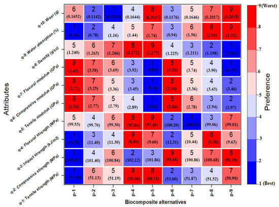 The results clearly reveal that no single PLA biocomposite alternative has better performance concerning all attributes at a time. However, it should be noted that the tensile strength (attribute q-1), compressive strength (attribute q-2), impact strength (attribute q-3) and water absorption (attribute q-9) of p-1 are superior among all biocomposite alternatives, while having the poorest tensile modulus (attribute q-5), compressive modulus (attribute q-6) and flexural modulus (attribute q-7). The alternative p-7 exhibits flexural strength (attribute q-4), while alternative p-3 records the best wear (attribute q-10) performance. The tensile modulus (attribute q-5), compressive modulus (attribute q-6) and flexural modulus (attribute q-7) of p-5 are the best among all biocomposite alternatives; however, they exhibit the lowest impact strength (attribute q-3) and the poorest density (attribute q-8). The results uncover no particular biocomposite alternative that shows the best solution considering all attributes simultaneously. Hence, it is difficult to suggest an option for which the biocomposite would deliver the highest performance. Therefore, the hybrid CRITIC–MABAC approach is utilized to rank these biocomposites.