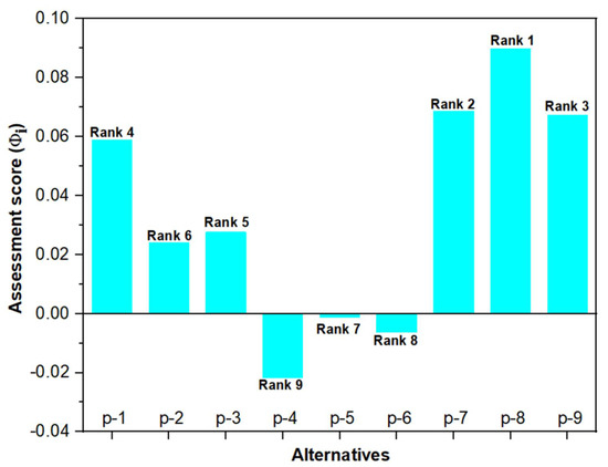The alternatives are ranked according to the obtained values of the assessment score (). The best alternative is one with the highest value.