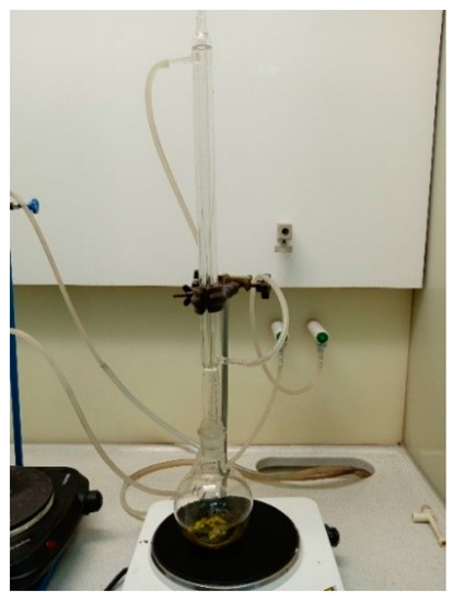 The determination of the COD of the water extracts after the biodegradation process of dust samples from molding sand MS no. 1 and MS no. 2 was carried out in accordance with the PN-ISO 6060:2006 standard “Water quality. Determination of the chemical oxygen demand” [27]. In the first stage, 10 cm3 of the aqueous extract were collected into the reaction flask, to which 5 cm3 of the potassium dichromate solution and a few porous glass spheres were added. After thorough mixing, 15 cm3 of a solution of silver sulphate in sulfuric acid were added very slowly to the solution. The reaction flask was then connected to a reflux condenser and the reaction mixture was heated to reflux and then held at 148 °C for 110 min. At this time, the reaction mixture was cooled rapidly to about 60 °C, diluted to about 75 cm3, and then cooled to room temperature. The course of the first stage of the determination-heating of the mixture in the reaction flask is shown in Figure 1.