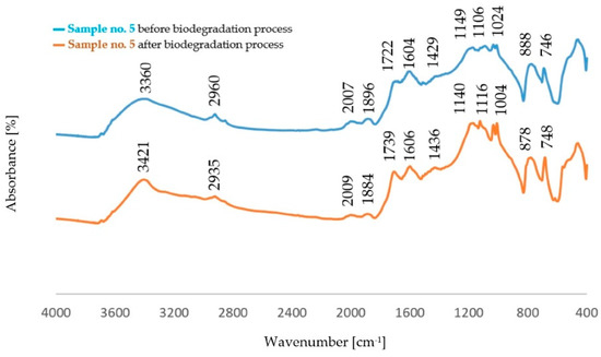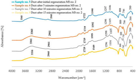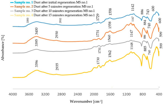 In the spectra obtained for all the dust samples obtained after the regeneration of the standard molding sand (dust from MS no. 1) and the molding sand with a 5% addition to the resin of a biodegradable component (dust from MS no. 2), the most characteristic is the band originating from the binder characteristic for phenol-furfuryl resin. These vibrations occur in the area of 1149–1142 cm−1 [28]. In the 3400 cm−1 region, there is a band corresponding to the stretching vibration of the O-H bond [29]. Another characteristic band is the one corresponding to the deformation vibrations of C-H bonds characteristic for the furan ring, occurring around 885 cm−1 [30]. In the region of 1360 cm−1, on the other hand, OH- group bands are visible, which correspond to vibrations originating from the furan or phenol ring [29]. These bands are characterized by a low intensity. The spectra obtained for post-regeneration dust from the molding sand with the addition of PCL also show bands characteristic of aliphatic polyesters [31,32].