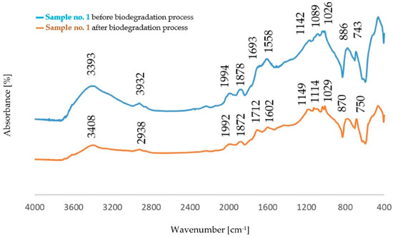 The comparison of the absorption bands for dust samples before and after the biodegradation process is shown in Figure 4, Figure 5, Figure 6 and Figure 7.
