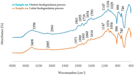 Comparison of the absorption bands for dust samples of molding sand MS no. 2 after 15 min of mechanical regeneration process, before and after the biodegradation process.