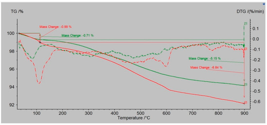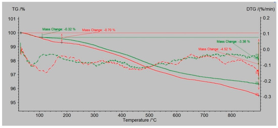 TG/DTG curves obtained by heating the sample no. 1—the dust sample from MS no. 1 after initial regeneration; before biodegradation (green line) and after biodegradation (red line).