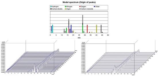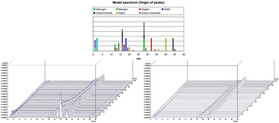 Selected samples were subjected to the thermogravimetric test and the differential thermal analysis (TG/DTA) in order to determine the changes in the mass of the tested sample and the thermal effects related to the changes in the sample (physical, chemical). The TG/DTA-QMS measurements were carried out using the STA 449 F3 Jupiter® thermal analyzer coupled to QMS 403C Aëolos by Netzsch (Selb, Germany) equipped with a TG-DTA sensor. The test was proceeded under the following conditions: pressure 10−2 mbar; inert gas Ar (99.9992%) 70 mL/min; heating speed 15 K/min. Measurements were determined using the Netzsch (Selb, Germany) Proteus Thermal Analysis 6.1.0 software. The residual gas analysis was carried out on the basis of the literature data from [26].