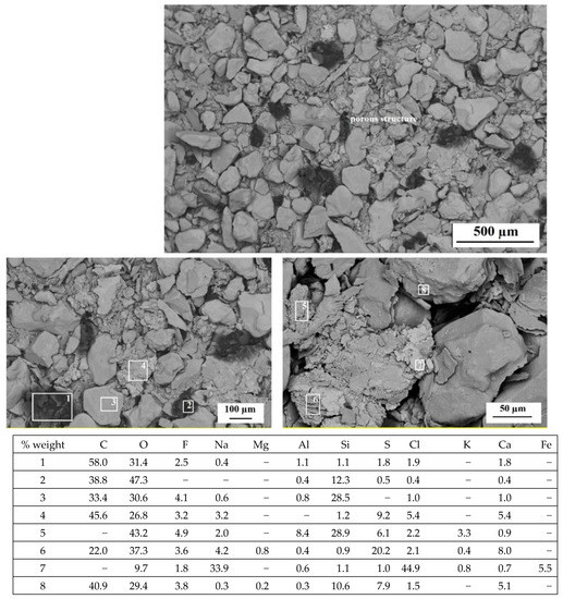 In the case of sample no. 5 derived from the molding sand MS no. 2, in which a biodegradable agent was applied to the binder, it can be observed that, as a result of the regeneration process, a much greater amount of organic residue was obtained than in the case of the sample no. 1 from MS no. 1 (Figure 12 and Figure 14). There are also matrix grains in the structure (Figure 14). After the biodegradation process in the aquatic environment in the sample no. 5 numerous porous structures appear, mainly between the grains of the quartz matrix (Figure 15). EDS analysis of these products confirmed the presence of mainly C and O and significant amounts of Si in areas 2, 3, 5, 8 (Figure 15). In area 7 the presence of a large amount of Cl and Na was identified. Analyses in selected areas also confirmed the presence of elements, such as F, Mg, Al, S, K, Ca and Fe. C, O and S are most likely derived from resin binder and sulfur hardener. Oxygen can also come from the grain matrix in combination with Si, and sulfur can also come from the water used in the biodegradation process, as well as Cl, Na, F, Mg, K and Ca (Table 2 and [36]).