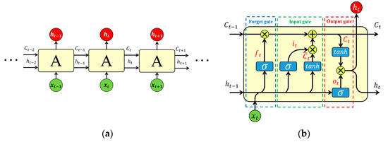 LSTM is a model structure of recurrent neural networks (RNN). In contrast with the conventional RNN, three gates are placed in each LSTM unit, including an input gate, an output gate, and a forget gate. Based on this special structure, LSTM effectively overcomes the vanishing gradient problem, which greatly limits classic RNNs [28]. A typical LSTM structure is shown in Figure 2.