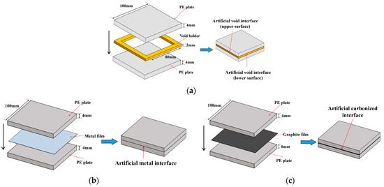 As shown in Figure 3, the size of the PE plate was 100 mm × 100 mm × 4 mm. For the artificial void interface sample, a resin holder with a size of 100 mm × 100 mm × 2 mm was placed between the upper and lower PE plates, which had a void area of 80 mm × 80 mm in its center. They were stacked on top of each other to simulate the upper surface (“polymer−air” interface (PA)) and the lower surface (“air−polymer” interface (AP)) of the void. To simulate metal and carbonized interfaces in the polymer, an aluminum film and a graphite film were placed between two PE plates, respectively. Different from the void interface, THz waves cannot penetrate metal and carbonized interfaces. Thus, these two artificial samples are only with the “polymer−metal” (PM) interface and the “polymer−carbonization” (PC) interface, respectively.