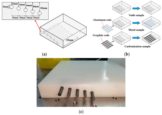 In addition, another PE sample was used in this paper to test the performance of the trained LSTM, and the size and shape of the sample are shown in Figure 4a. The sample was a PE block with five holes, which can simulate voids at different depths in the polymer. As shown in Figure 4b, by inserting aluminum rods and graphite rods in the holes, the metal interfaces and the carbonized interfaces in the polymer can also be simulated.