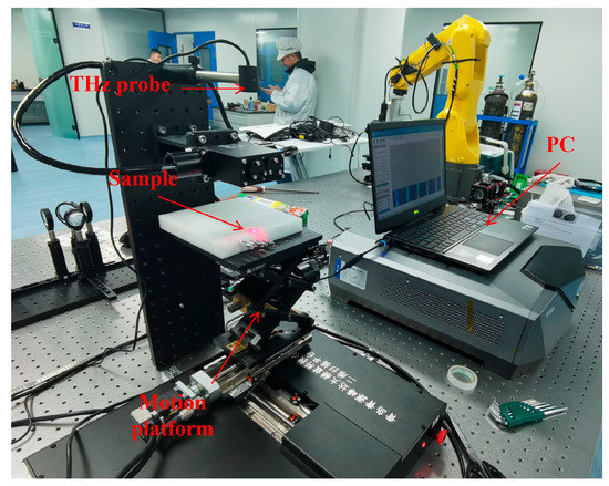 In this paper, QT-TO1000 from Quenda Technology Ltd., China, was used as the THz time domain spectroscopy system, which can emit and receive electromagnetic waves of 0.1–3.5 THz. Its maximum scanning area is up to 100 mm × 100 mm with a step length of 0.3 mm, and its scanning speed is up to 60 pixels per second. As shown in Figure 5, the whole system includes a THz probe, a motion system, and a PC. The THz probe is used to emit and receive the THz waves, and the motion platform is driven by three motors in X, Y, and Z directions, respectively. Both of them are connected to the PC, which controls the motion platform and collects the THz waves’ data to realize the scanning of samples.