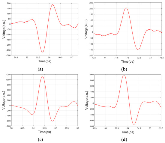 First, waveform data were collected from artificial interface samples for the training of LSTM. The sample was placed on the motion platform. Before collecting data, the height of the platform was adjusted to make sure that the artificial interface was near the focus of the THz beam, in which case the reflected pulse amplitude would reach the maximum. A 50 mm × 50 mm area in the center of three artificial interface samples was scanned, separately, in a step length of 1 mm. Then, the reflected waveform data of the artificial interface samples could be collected. Typical reflected pulse waveforms are shown in Figure 6.