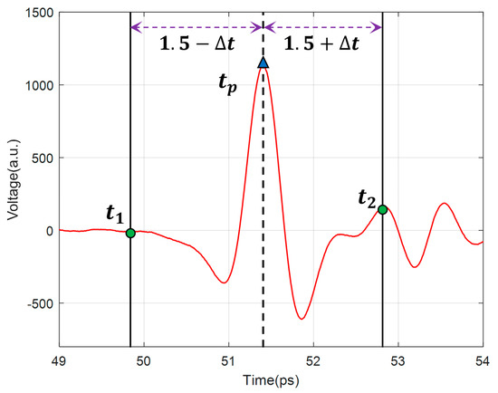 After that, the pulse data of the artificial interfaces were extracted from the scanned waveforms. As shown in Figure 7, and are the start time and end time of the pulse, respectively, and is the absolute maximum time (positive or negative peak) of the pulse. The positions of and can be determined by , which can be expressed as
