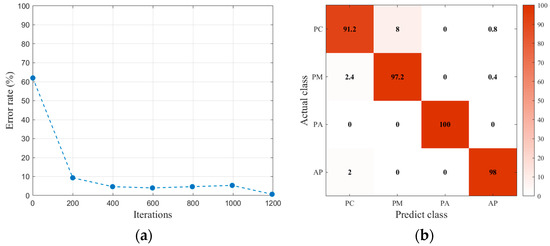 Training results of LSTM: (a) training error rate of LSTM; (b) classification accuracy of the validation set.