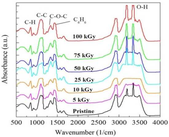 - Ali, Z.I.; Ali, A.; Hosam, A.M. Effect of electron beam irradiation on the structural properties of PVA/V2O5 xerogel. Spectrochim. Acta Part A Mol. Biomol. Spectrosc. 2009, 72, 868. [Google Scholar] [CrossRef] [PubMed]
