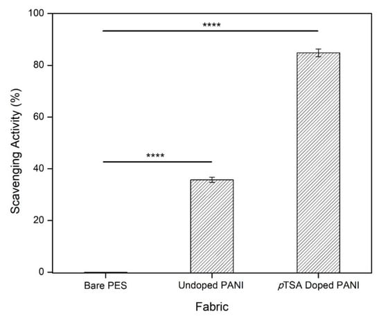 Scavenging activity of bare PES fabric (control), undoped PANI fabric, and pTSA-doped PANI fabric.