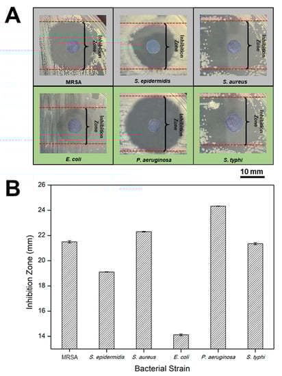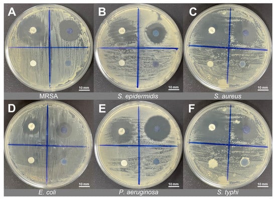 The antibacterial action of deprotonated and protonated PANI fabrics was evaluated through the Kirby–Bauer disc diffusion method, which resulted in a substantial indication of antibacterial effects [32]. The inhibition zone (mm) created around the tested fabric on MH agar was measured for antibacterial properties analysis (Figure 3A–F). In this study, Gram-positive bacteria (MRSA, S. epidermidis, and S. aureus) and Gram-negative bacteria (E. coli, P. aeruginosa, and S. typhi) were chosen to investigate the antibacterial performance of PANI fabrics.