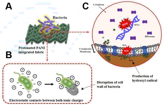 There are several tentative mechanisms that can contribute to the antibacterial activity of protonated PANI fabrics against bacteria. When PANI fabric was exposed to the bacteria, cationic antibacterial compounds such as hydrogen (H+) were triggered [22]. Consequently, these compounds could penetrate the anionic bacterial membrane. The electrostatic contacts between both ionic charges of protonated PANI and bacterial membranes can interfere with their proliferation, and also result in disruption of their cell walls, which could lead to bacterial cell death (Figure 5A,B).