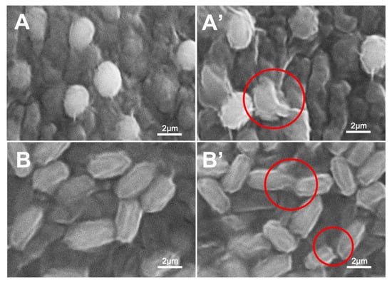SEM images of (A) untreated and (A’) treated S. aureus; (B) untreated and (B’) treated P. aeruginosa. Treated cells were exposed to protonated PANI fabric. Red circles indicate cell membrane disruption.