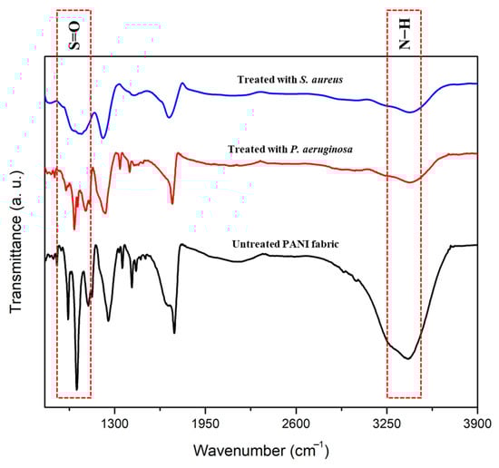 FTIR spectra of untreated PANI fabric, and of PANI fabric treated with S. aureus and P. aeruginosa.