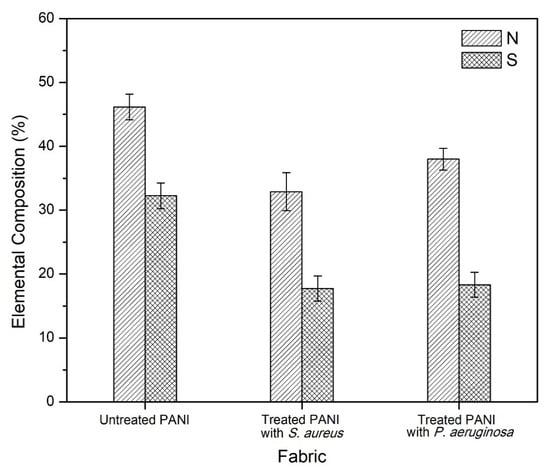 Elemental compositions of nitrogen (N) and sulfur (S) in untreated PANI fabric, and in PANI fabric treated with S. aureus and P. aeruginosa.