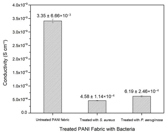 PANI fabrics treated with S. aureus and P. aeruginosa show significantly reduced conductivity values by one (1) order of magnitude, from 3.35 ± 6.66 × 10−3 S cm−1 to 4.58 ± 1.14 × 10−4 S cm−1 and 6.19 ± 2.46 × 10−4 S cm−1, respectively. These drops would significantly disturb the electrical performances of electronic applications; however, the values of both treated fabrics still remain within the range of metallic conductors in the CPs [10,42].