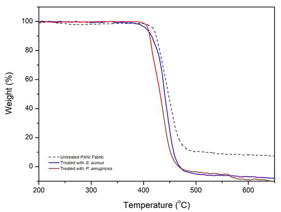 TGA was used to investigate the thermal stability of the PANI fabric in response to S. aureus and P. aeruginosa, as shown in Figure 10. It was found that the major thermal decomposition of untreated PANI fabric began at around 413.35 °C, and ended at 503.25 °C with ~90% decomposition. At this phase, the decomposition of the cellulose structure of PES fibers, degradation of PANI moieties, and depletion of dopant are fully complete [16,44]. Additionally, these phenomena could be credited to the interchain cross-linking and breakdown of the PANI backbone from the PES fabric. Based on a recent report [44], dopants such as pTSA are likely to significantly improve the thermal stability of untreated PANI fabric. For some reason, these occurrences are due to the structural modification and strong bonding of sulfur with PES fiber.