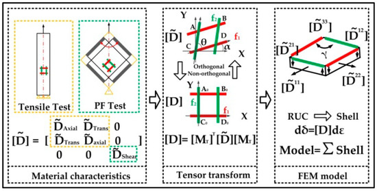 Researchers treat the plain-weave fabric material as macrolevel periodic materials consisting of a series of mesoscale patterns. This mesoscale pattern is called the representative unit cell (RUC) [46]. For the plain-woven dry fabric, a constitutive model [47] is created as follows. Firstly, acquire the material’s characteristic matrix. Secondly, establish the transforming tensor matrix of the global orthogonal coordinate and non-orthogonal coordinate. Thirdly, replace the RUC with the square plate element of FEM, see Figure 2.