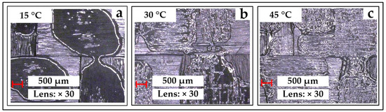 The resin conditions at three temperatures with magnification of the microscope is 30: (a) the condition at 15 °C; (b) the condition at 30 °C; (c) the condition at 45 °C.