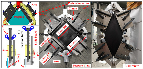 Advanced composite materials significantly improve performance and reduce aviation parts’ weight and cost. Composites, especially the carbon fiber plain-woven thermoset prepreg (CFPWTP), have been increasingly accepted in the aerospace manufacturing industry because of their light weight, high strength, corrosion resistance and formability [1]. When designing composite parts with CFPWTP material, this laminated material usually needs to be preformed layer by layer on the nondevelopable mold surface [2]. At this time, the material will endure great in-plane tensile, compression or shear deformation, which is mainly presented as the interfiber slippage and rotation. Some fiber bundles will be stretched or stacked together if the fiber movement is hindered, and local materials will be bridged or wrinkled [3,4]. Without the correct operation, these defects will seriously damage the aerodynamic shape or interlayer strength of products. Common treatments [5,6,7] include stretching, pressing the defect area, heating or redesigning the cutting size. However, arranging these processes requires firstly determining the deformation characteristics of the CFPWTP material.