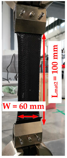 In order to obtain the material property for Equation (15), the PF test and axial tensile test are carried out in this section, and the test devices are shown in Figure 3. The test machine is INSTRON 5982-100 kN. The PF test device arm length Larm is 300 mm, and the size of the cross-shaped material is shown in Figure 6. As for the tensile test, the preparation size of materials is 60 mm × 200 mm. The effective tensile length Lmat2 is 100 mm, as shown in Figure 7. The stretching speed of the test machine is always 10 mm/min. In addition, because the fabric material is relatively soft, the material may relax without tension and damage accuracy. The tightening force (20 N) is applied to ensure the material tightening.