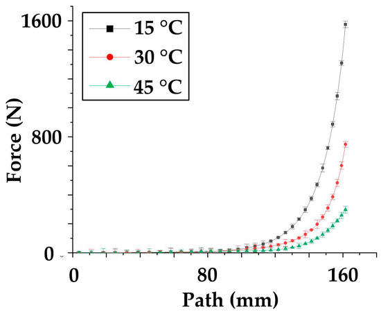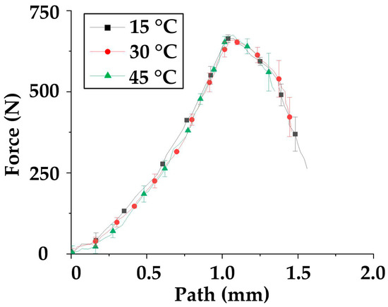As for the axial tensile test, the curves can be seen in Figure 9. Firstly, the three curves have similar shapes: 1. pre-tensioning stage (0–0.25 mm); 2. straightening stage (0.025–1 mm); 3 fracture stage (1–2 mm). Although the three curves are measured at different temperatures, there is only a small difference in the tensile strength—680 N at 15 °C; 671 N at 30 °C; and 670 N at 45 °C—indicating that the temperature has little effect on the axial tensile strength. The error value is small (<20 N) in the rising stage but becomes large after a fracture (>100 N). Thus, the curve-fitting process is only applied to the curves before fracture. Through comparison, the max amplitude of the error bar of the three curves is about 20 N, due to the fact that the max error value/maximum value (20 N/670 N) of the curve is less than 3%. In this paper, it is believed that the curve can characterize the axial properties of the material