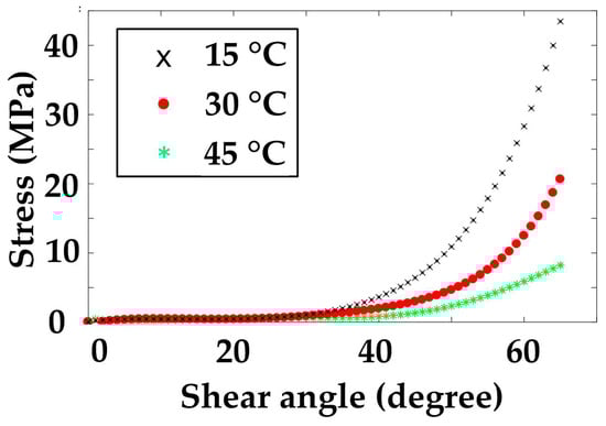 As for the shearing test, three shear curves show similarity. From Figure 10, on the whole, the three curves are nonlinear and similar to exponential curves. However, with careful analysis, it can be found that the curve contains approximately linear parts (0–100) and fast-rising parts (100–160). From the view of the curves’ maximum value at the linear stage (0–100 mm), the max force of 15 °C is approximately 60 N. At the same stage, the 30 °C ultimate value is about 30 N, while the 45 °C value is 20 N. When the material enters the nonlinear stage (100–160), the maximum value of the 15 °C is about 1600 N, which ranks first, and the value at 30 °C is second at about 790 N. The ultimate value of the 45 °C curves is about 300 N at the third level. Because the maximum curve value (300 N) at 45 °C is 18.7% of the curve value (1600 N) at 15 °C, temperature influence on shear deformation is not negligible during analysis. The above material curve characteristics can be explained from the following aspects. In the first nearing linear parts, the prepregs experienced pure shear condition where the warp and weft tows rotate then compact, resulting in the force increasing gradually. In the nonlinear parts (100–160), the fiber rotation is restricted due to shear locking, and the force along the fiber induces a sharp increase. As for the error, in the rising stage, the max error of the 15 °C curves is 30 N, the max value is 31 N for the 30 °C, and the error amplitude is 20 N for the 45 °C. Because the max error value/maximum (31/790) value of the curve is no more than 7%, and the error is evenly distributed on both sides of the curve, these curves are considered to be sufficient to characterize the shear properties of the material.